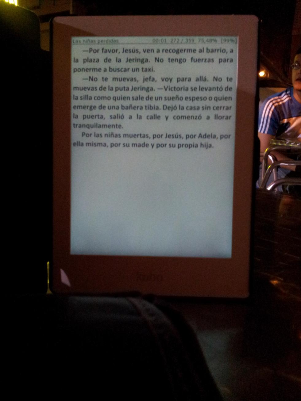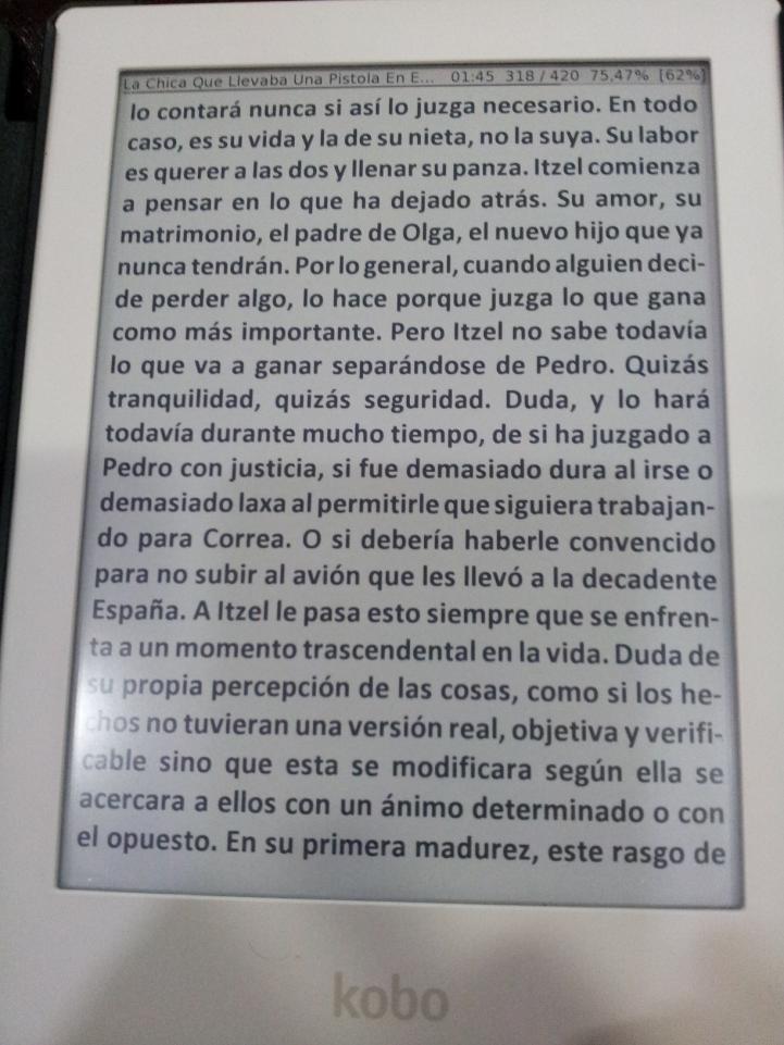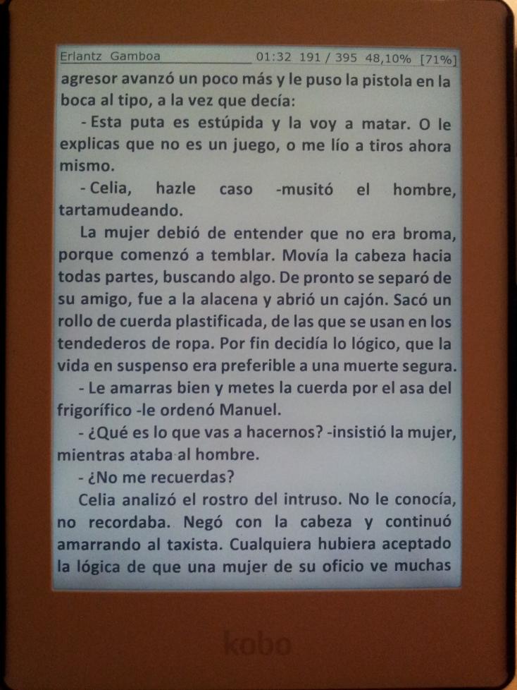 ersott te agradezco tu colaboración y ayuda. Tienes razón en lo que dices, si no molesta y con el discurrir del tiempo y el uso, nos acostumbramos, pues todo arreglado. Cero grados. ¡Qué bien, ni frío ni calor! Insisto, comprendo lo que dices y te lo agradezco. Pero aunque me da algo de pereza volver a cambiar el Kobo, sí, me molesta que siendo más caro que otros no funcione mejor, acorde con su mayor precio. También me molesta que no respeten su propaganda: "el lector reinventado", o algo similar, y no les exijamos que cumplan lo que prometen. Me molesta, además, que esta empresa que gasta tanto en diseño y marketin -que nos cobran, por supuesto- con la dignísima excepción del Servicio de Atención al cliente, tenga tan pésimos controles de calidad y de producto terminado y listo para su venta. Tanto es así que la adquisición -o el cambio- de uno de sus lectores se está asemejando a la compra de un décimo de lotería, me tocará uno bueno... También me molesta que si no es por tod@s vosotr@s, tú mismo, surquizu, terisa, mylady... tant@s otr@s, los forer@s de mobilread... en estos dispositivos caros no se pueden leer *.pdf, a pesar de ser uno de sus formatos nativos. Y, por supuesto, me molesta que en este HD lea y vean los libros mucho peor que en el tristemente fenecido, cuya pantalla funcionaba muy bien.