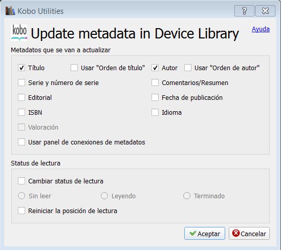 Hace un año cuando compré el Kobo Aura HD tuve problemas para configurar Calibre y con vuestra inestimable ayuda pude configurar el plugin Koboutilities. En Calibre tengo ordenados los libros por temática Etiquetas Novele negra y estante Novela negra y en el Kobo en la Biblioteca, Colecciones en este caso Novela negra, para no tener los libros leídos mezclados con los no leídos en las Colecciones del Kobo cree unas colecciones con las temáticas de los libros, es este caso Novela negra y antepuse Leídos, quedando las colecciones de libros leídos, Leídos Novela negra, cuando he leído un libro le cambio en Metadatos Personalizados la colección y lo paso a libros leídos de la temática de que se trate, selecciono en Calibre el libro leído y en KoboUtilities pulso en Actualizar metadatos en la biblioteca del dispositivo y hasta ayer me los ponía en el Kobo en la colección Leídos, al pulsar en Actualizar metadatos en la biblioteca del dispositivo me sale esta ventana que no se si está bien configurada y no se si falta activar alguna casilla para que funcione.