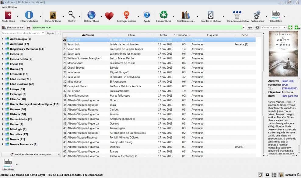 Tarisa, tienes razón y no es criticar, aveces me sucede que como yo se lo que quiero creo que los demás también lo saben y no me explico, con lo que se quedan a oscuras. Empezare desde el principio. En el Papyre 6,1 y en el Sony T1 Rooteado tengo la biblioteca de la siguiente manera, directorios de las temáticas y dentro de ellos los subdirectorios con el nombre de los autores y dentro los libros de cada autor, en el Koko no se pueden crear subdirectorios y lo que eran directorios en los otros lectores en el Kobo son colecciones, de echo la manera del Kobo me gusta mas, pero no consigo tener en cada colección los autores por orden alfabético, por ejemplo si en la colección Aventuras el autor Alberto Vázquez Figueroa es el único que empieza con la letra A tendría que ser el primero con todos los libros que tenga de este autor, el autor con la letra B Bill Bryson tendría que estar primero que Black Campbell y así sucesivamente, pero no lo consigo tener de esta manera, todos los libros de un autor están juntos pero los autores no están por orden alfabético, te adjunto una captura de los metadatos de un libro por si me falta algo que añadir para que los autores queden por orden alfabético.